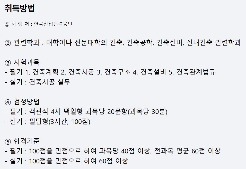 이 자격증은 건축 설계, 구조, 시공 및 재료 등에 대한 전문적인 지식을 요구하며, 건설 현장에서 안전하고 효율적인 시공 관리를 수행하는 데 중요한 역할을 합니다. 건축기사는 건설사, 설계사무소, 감리 회사, 공공기관 등 다양한 산업에서 활동할 수 있습니다.