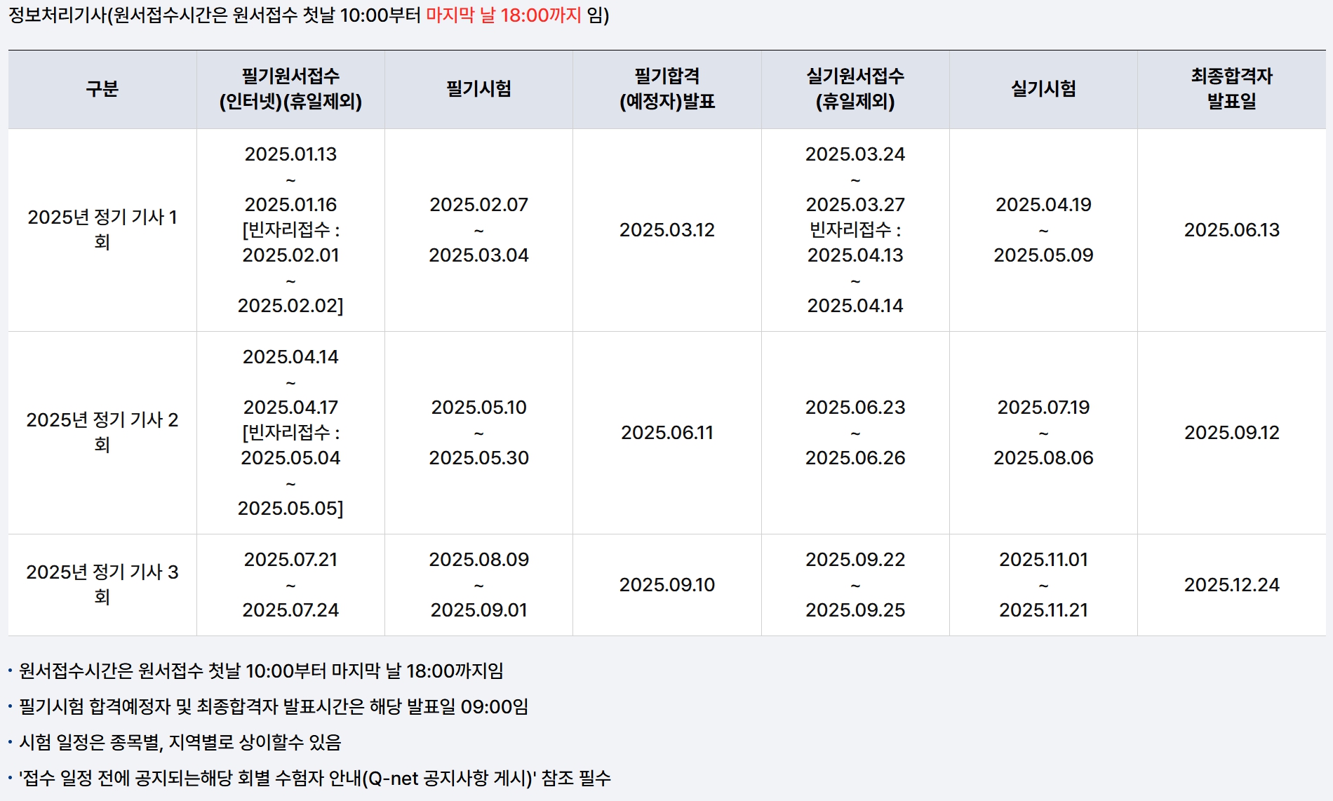 2025년 정보처리기사 시험은 총 3회 진행됩니다. 정확한 일정은 한국산업인력공단(Q-Net)에서 발표되므로, 반드시 공식 사이트를 확인해야 합니다.