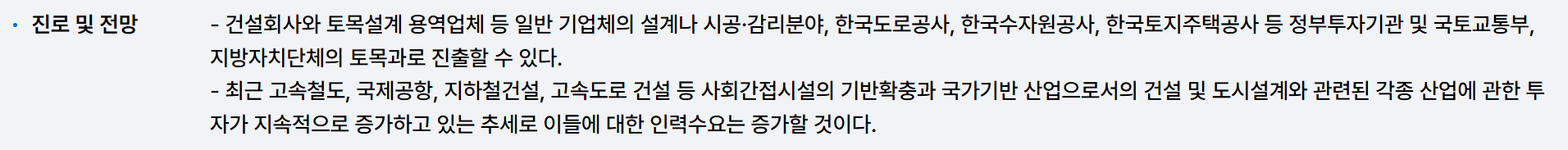 이 자격증은 토목 구조 설계, 시공 기술, 수리 및 지반 공학 등의 전문적인 지식을 요구하며, 각종 공공 및 민간 건설 프로젝트에서 안전하고 효율적인 시공 관리를 수행하는 데 중요한 역할을 합니다. 토목기사는 건설사, 엔지니어링 업체, 공공기관, 연구소 등 다양한 분야에서 활동할 수 있습니다.