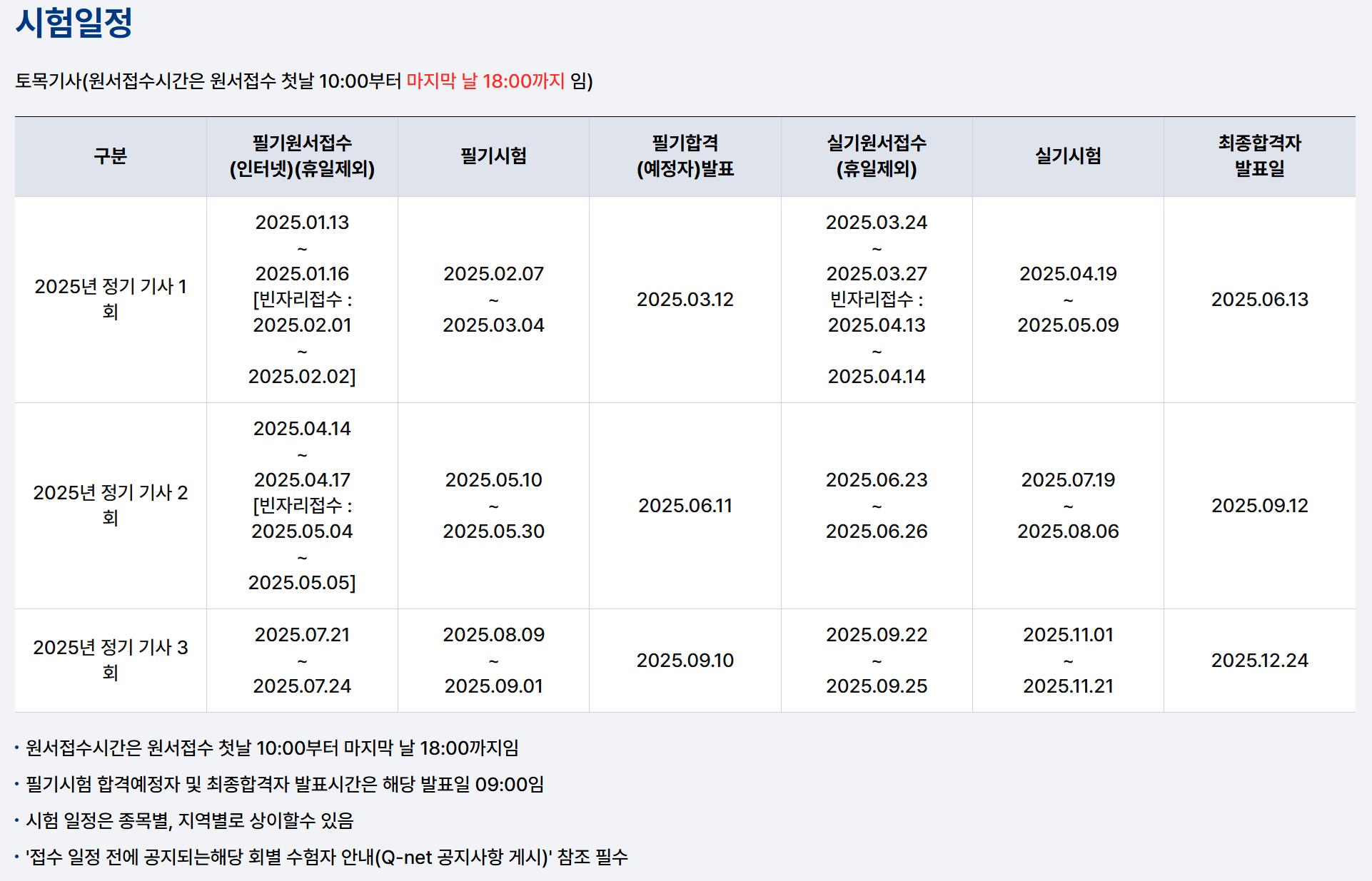 2025년 토목기사 시험은 총 3회 진행됩니다. 정확한 일정은 한국산업인력공단(Q-Net)에서 발표되므로, 반드시 공식 사이트를 확인해야 합니다.